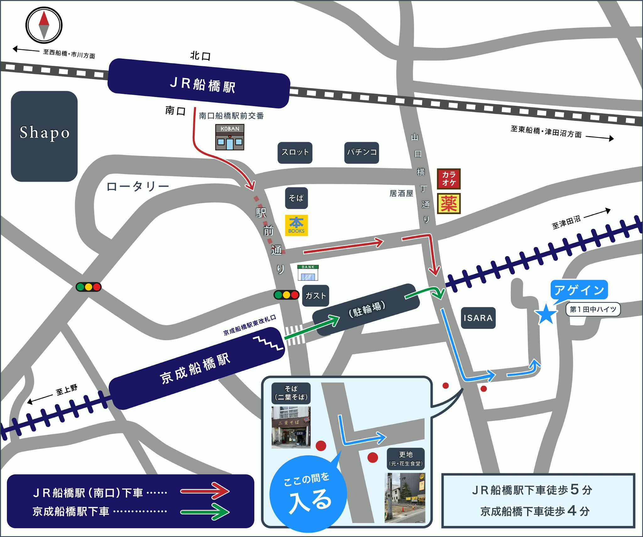 会社案内 オールドの毎日に『再び』ワクワクを! 会社概要 社名 株式会社アゲイン 代表者名 近藤 徹 所在地 〒273-0005 千葉県船橋市本町四丁目16-30 第一田中ハイツ101 連絡先 047-411-7456 事業内容 労働者派遣事業職業紹介事業巡回検診予約代行サービス前各号に附帯関連する一切の事業 資本金 2000万円 設立年月日 令和7年3月13日 会社法人番号 0400-01-137908 有料職業紹介事業許可証 許可番号 12-ユー301234 許可年月日 令和7年6月1日 労働者派遣事業許可証 許可番号 派12-301748 許可年月日 令和7年6月1日 アクセス 京成船橋駅東側出口より徒歩4分 JR船橋駅/東武船橋駅 南口より徒歩5分 道順 【京成船橋駅からお越しの方】 ①京成船橋東口改札を出て、目の前のエスカレーター(又は階段)を降りる。②公道(駅前通り)にでて目の前の横断歩道を渡る。③ガスト入口の右側の駐輪場を突き抜ける。④公道(山口横丁)に出たら右へ。⑤二葉そば前、更地と電柱の間の路地にはいる。⑥突き当り手前の2階建てアパートが第1田中ハイツとなります。 【JR船橋駅/東武船橋駅からお越しの方】 ①JR船橋駅東口改札、東武船橋駅改札を出て、コンコースを右に、南口へ。②南口を出て、駅前ロータリー左(交番がある方)へ。③ときわ書房と三井のリハウスの間道を左折するか、京成線のガード下の駐輪場を突き抜ける。④公道(山口横丁)に出たら右へ。⑤二葉そば前、更地と電柱の間の路地にはいる。⑥突き当り手前の2階建てアパートが第1田中ハイツとなります。 【道順におけるご注意】 ⑤二葉そば前、更地(旧花王食堂)と電柱の間の路地にはいる際に、見過ごして通り過ぎてしまう事例がございます。路地手前に電柱と看板があり、舗装されていない1m程度の道なので見逃しやすい路地です。駅から向かって、二葉そばさんのお向かいの路地なので、見過ごさないようご注意ください。⑥路地を入って道なりに30mほど進むと2階建てアパート「第1田中ハイツ」があります。門扉越しに、「株式会社アゲイン」の表札が貼られたアパートの入り口ドアがあります。このアパートを見逃して進んでしまうと、突き当りとなります。突き当りまで進んでしまったら、少しだけ戻ってください。